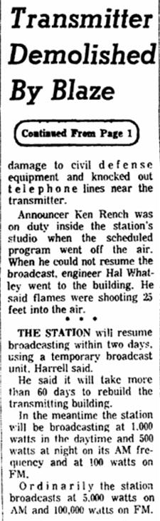 "I remember the day my phone rang and I was told the transmitter building had burned down and I didn't need to go in that night," recalled Doug Adams, former newsman and sportscaster for KDNT. "I lived in a mobile home park on Teasley Lane, so I went down the road to see it. The next day, I met George Marti there, and ran some errands for him to help get us back on the air." But the scare from the 1968 fire at the studios still remained: "I remember when I started work at KDNT, there was a fire extinguisher right on the console, next to the turntable. Buford (Harrell, newscaster and salesman) told me--with dead seriousness--'Use it if anything catches on fire,'" Doug said.